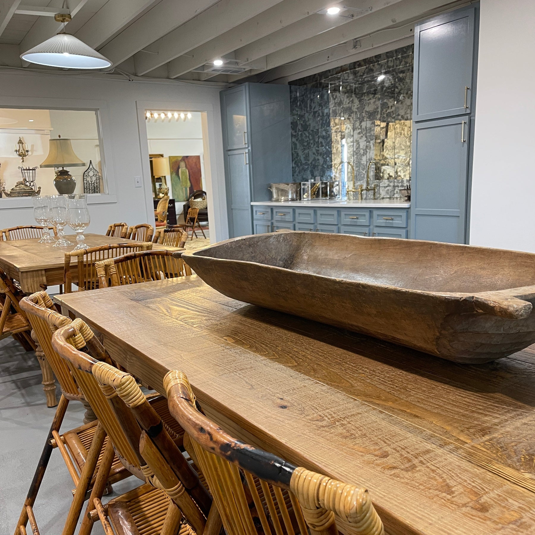 - Two farm tables, 16 rattan folding chairs